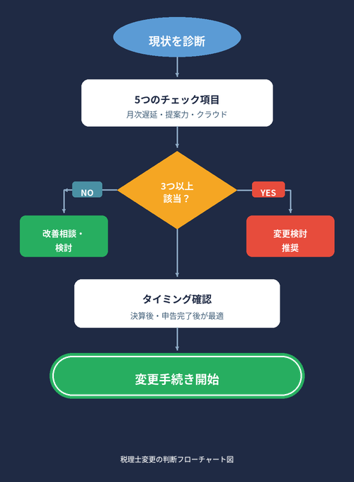 現状の税理士では経営に悪影響が出ている可能性があります。早めの変更を強くおすすめします。適切な税理士への変更で、経営判断のスピードと質が大きく向上します。